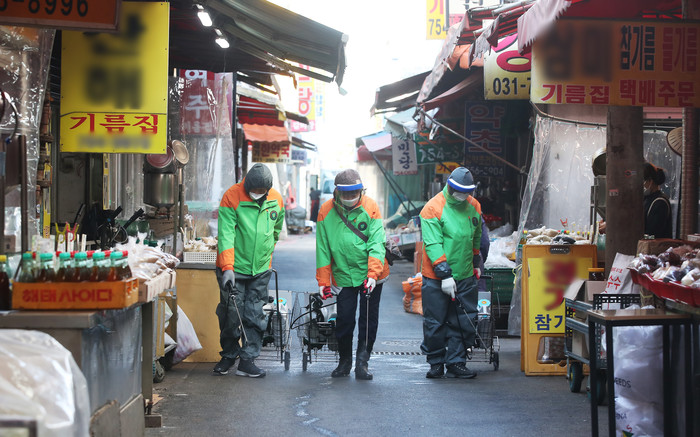 8일 오전 경기 성남시 모란전통기름시장에서 성남시자율방재단원들이 모란민속5일장 장날을 하루 앞두고 코로나19 예방을 위해 방역을 하고 있다.