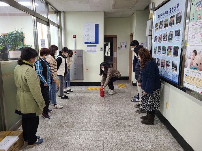 경기 수원시 권선구 입북동 행정복지센터는 8일 입북동 행정복지센터 전직원을 대상으로 소방훈련을 실시하고 화재 초기 진압 및 대처 방법과 개인별 임무 수행방법, 소화기·소화전 작동방법 등을 숙지했다. 사진은 이날 소방훈련을 실시하고 있는 모습. (사진제공=권선구청)
