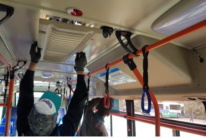 부산시가 시내·마을버스가 운행 중 에어컨을 가동할 경우 창문을 열어 환기해야 한다는 내용을 포함한 대중교통 분야 신종 코로나바이러스 감염증(코로나19) 감염병 확산 예방 조치를 시행한다고 14일 밝혔다. 사진은 시내버스 에어컨 점검 모습.