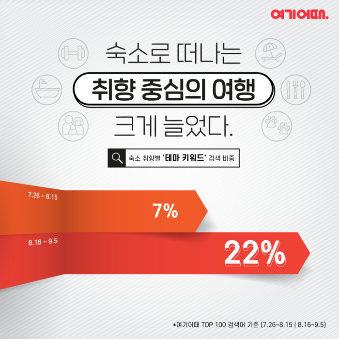 여기어때는 지난 8월16일부터 이달 5일까지 상위 검색어 100개를 분석한 결과, 이 중 이용자의 취향 중심 키워드 검색량이 전체의 22%를 웃돌았다.