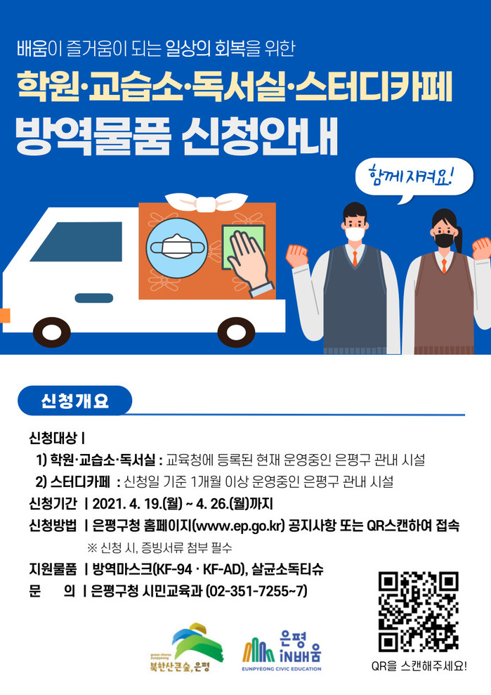 신청은 인터넷 신청 폼을 활용하여 비대면으로 진행할 예정이며, 은평구청 홈페이지 공지사항을 확인해, 신청 링크 또는 QR스캔해ㅑ 접속 후 가능하다.