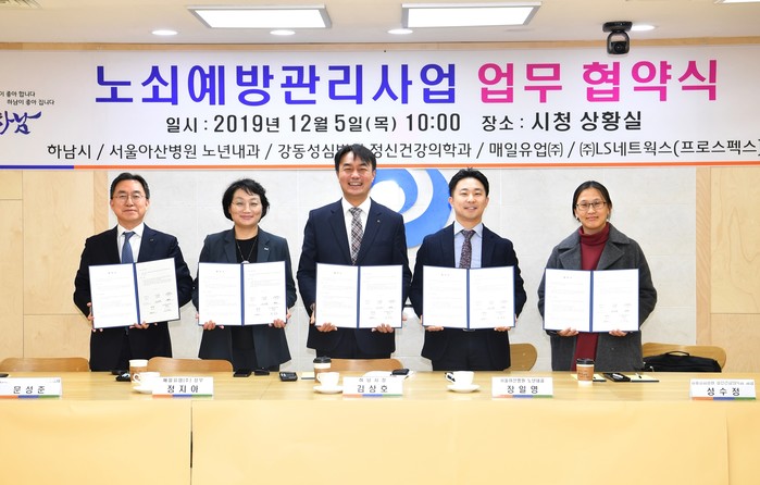 경기 하남시는 5일 서울아산병원 노년내과, 강동성심병원 정신건강의학과, 매일유업, LS네트웍스(프로스펙스)와 함께 노쇠예방관리사업 추진을 위한 협약을 체결했다. 사진은 김상호 시장(가운데)과 병원 및 기업 관계자들이 기념촬영을 하는 모습. (사진제공=하남시청)
