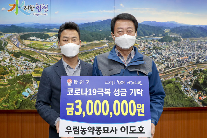 합천군(군수 문준희)은 합천읍의 이도호 우림농약종묘사 대표가 지난 5일 합천군청을 방문해 코로나 19로 어려움을 겪고 있는 군민들을 위해 써 달라며 300만원을 기탁했다고 밝혔다.