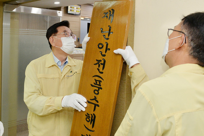 동대문구는 최근 풍수해 재난안전대책본부 개소식을 개최하고 재난상황실 운영을 시작했다. 재난상황실은 오는 10월15일까지, 상황총괄반 외 12개반이 운영된다. 사진은 개소식에서 유덕열 구청장(왼쪽)이 현판을 달고 있는 모습. (사진제공=동대문구청)