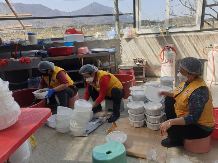 경기 포천시에 소재한 대한적십자사 관인봉사회는 최근 자발적 성금으로 마련한 재료로 만든 열무김치와 밑반찬을 지역내 취약계층에 전달했다. 사진은 회원들이 직접 만든 음식을 포장하고 있는 모습. (사진제공=포천시청)