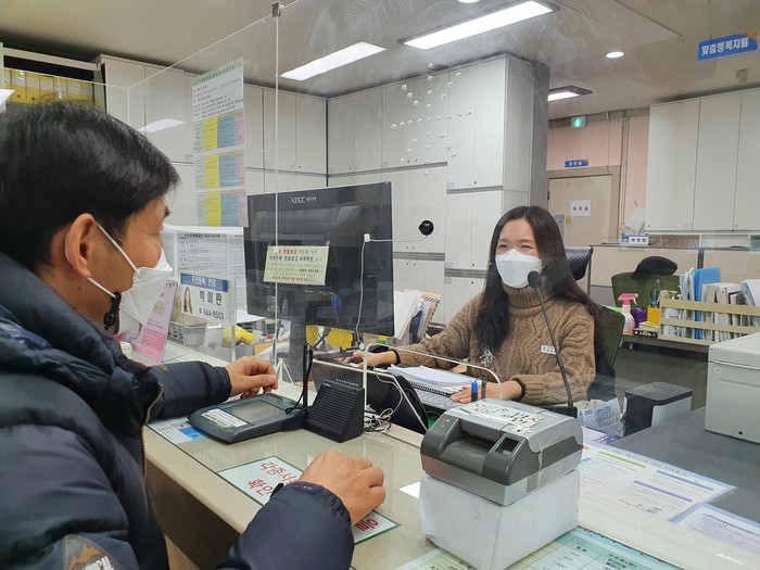경기 이천시 신둔면은 코로나19 예방과 확산 방지를 위해 설치한 가림막이 의사소통에 어려움을 줘 행정복지센터를 방문하는 주민과의 소통강화를 위해 민원실 창구 3곳에 비대면 양방향 마이크를 설치했다. 사진은 방문 민원인과 마이크를 이용해 대화를 하는 모습. (사진제공=이천시청)