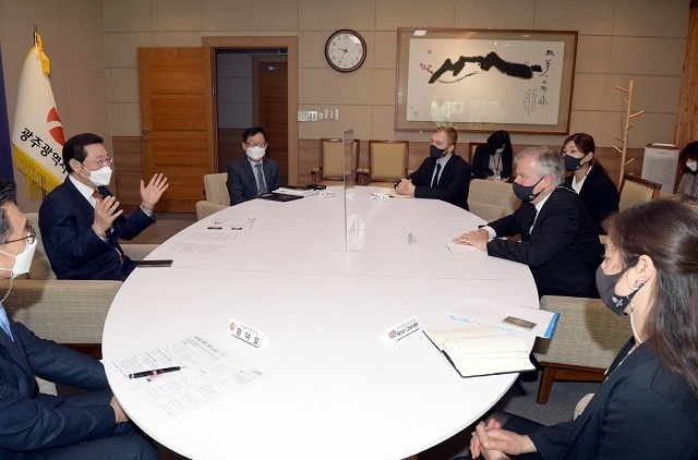 [광주=정찬남 기자] 이용섭 광주광역시장은 15일 오전 시청 접견실에서 사이먼 스미스 주한 영국 대사를 접견하고 광주와 영국 간의 기후변화 대응방안 등에 대한 협력방안을 논의했다.