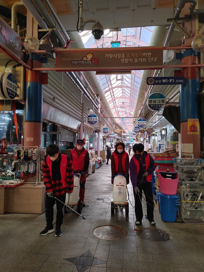 거창시장번영회에서도 매일 상가 구석구석에 방역활동과 깨끗하고 편리한 공중화장실을 위해 화장실 3개소에 손 소독제, 화장지, 비누 등을 비치하고, 매일 2회 청소를 실시하고 있다.