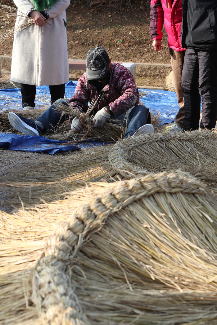 25일 경기 고양시 일산밤가시초가에서 초가 지붕 전문가가 지붕 이엉과 용마름 엮기를 시연하고 있다. 약 150년 전에 지어진 일산밤가시초가는 조선후기 전통적인 서민 주택 형태이며 현재 일산 신도시 지역에서 유일하게 남은 초가이다.