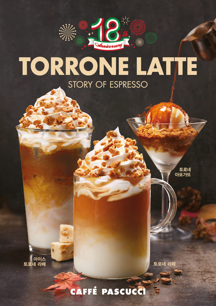 파스쿠찌는 매년 브랜드 론칭 기념일에 맞춰 이탈리아 에스프레소의 정체성을 담은 S.O.E(Story of Espresso) 메뉴를 출시하고 있다. 2017년의 피오르디, 2018년의 버터스카치, 2019년 골든색 에스프레소를 활용한 메뉴를 출시한 바 있다. 이번 18주년 기념 메뉴는 이탈리아의 전통 디저트인 ‘토로네(Torrone)’를 활용했다.