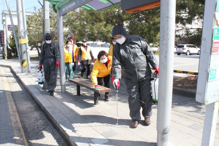 경기 의정부시 자금동 적십자봉사회는 코로나19 확산 방지를 위해 지역내 유동인구가 많은 상가, 버스정류장, 희망회복종합지원센터 등을 대상으로 방역활동을 하고 있다. 사진은 회원들이 버스정류장에서 소독작업을 하는 모습. (사진제공=의정부시청)