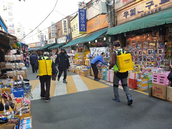 서울 종로구는 코로나19 확산 방지를 위해 국내외 관광객들이 많이 찾는 광장시장, 통인시장 등을 대상으로 감염병 예방 전문업체를 투입해 방역작업을 하고 있다. 사진은 최근 구 관계자들이 '문구완구거리'에서 소독을 하고 있는 모습. (사진제공=종로구청)