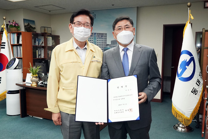 | ▲ 29일 박희수 동대문구시설관리공단 신임 이사장이 임명장을 받고 유덕열 구청장(왼쪽)과 기념촬영을 하고 있다. (사진제공=동대문구청) |