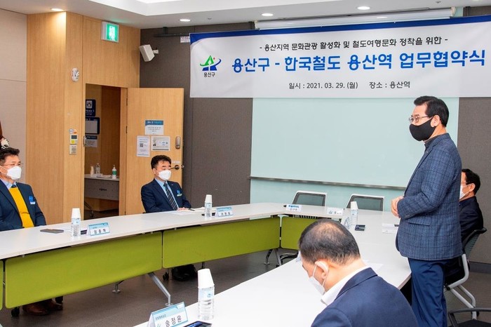 용산구와 한국철도 용산역이 29일 ‘문화관광 활성화’ 업무협약을 맺었다. 협약에 따라 두 기관은 지역축제·관광자원 홍보, 철도여행상품 개발운영 등에 있어 상호협력할 방침이다. 사진은 성장현 구청장(오른쪽)이 문화관광 활성화 업무협약식에서 인사말을 하고 있는 모습. (사진제공=용산구청)
