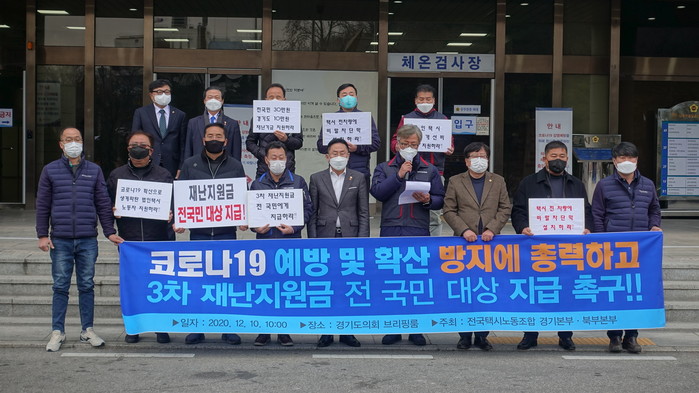 김연풍 전국택시노조 경기지역본부 의장은 성명서를 통해 3차 재난지원금을 전국민 대상으로 지급하도록 하는 정책에 적극 지지하며, 경기도에서 선제적으로 1370만 경기도민에게 1인당 10만원씩 지급해줄 것을 촉구했다.