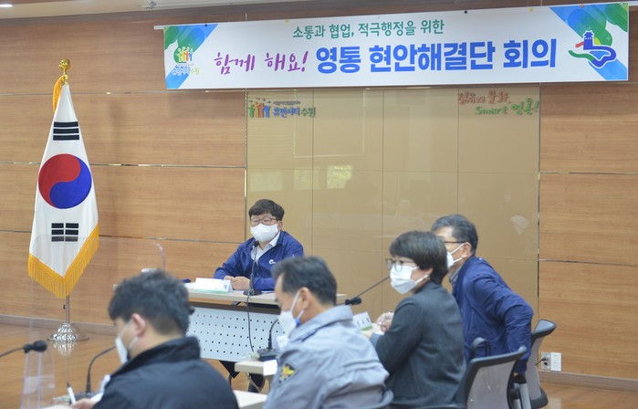 경기 수원시 영통구는 지난 6일 영통구청사거리 차선확장 및 택시승강장 설치와 관련해 시·구 관련 부서 및 외부 교통전문가가 모여 회의를 개최하고 해당지역 교통체계 변경사항 및 도로확장 가능 여부 등을 면밀히 살폈다. 사진은 김용덕 구청장(왼쪽)이 회의를 주재하고 있는 모습. (사진제공=영통구청)