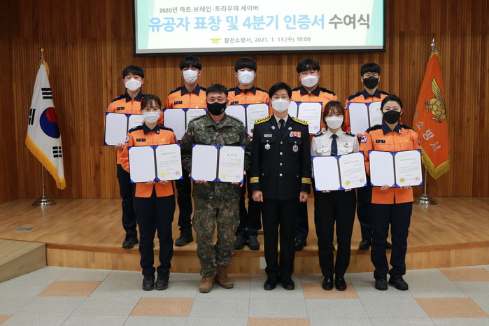 이번에 수여한 세이버 유공 표창은 합천소방서 2020년 하트·브레인·트라우마 세이버 인증 대상자 중 4명(소방3, 일반인1)을 선발하여 수여하였고, 또한 4분기 급성뇌졸중 및 중증외상 환자를 신속한 응급처치와 치료 가능한 병원으로 이송한 구급대원 11명에게는 브레인 세이버와 트라우마 세이버 배지와 인증서 수여식을 함께 진행하였다.