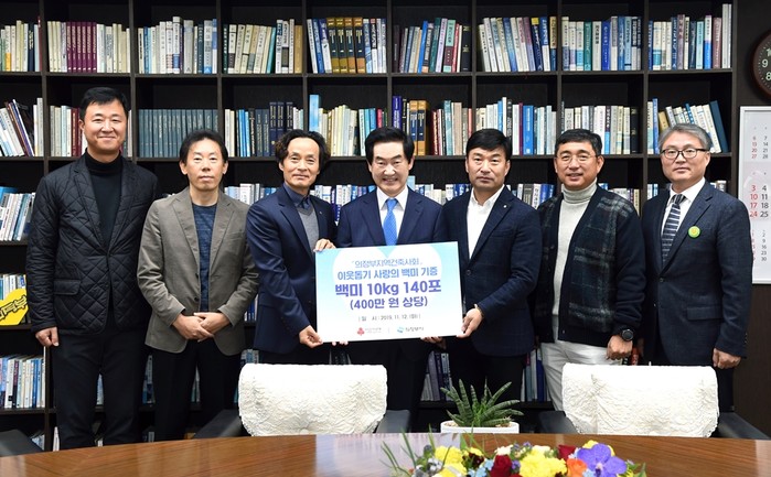 경기 의정부시 지역건축사회는 12일 이웃사랑 나눔 캠페인인 ‘100일간 사랑릴레이 배턴잇기 운동’에 참여, 시청에 방문해 10kg 쌀 140포를 기탁했다. 사진은 안병용 시장(가운데)과 지역건축사회 관계자들이 기념촬영을 하는 모습. (사진제공=의정부시청)
