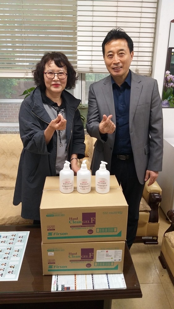 인천 미추홀구 학익2동 행정복지센터는 최근 바른플란트치과로부터 손 소독제 40개를 전달받았다. 센터는 전달받은 손 소독제를 지역내 홀몸노인 가구와 한부모 가정 등에 전달할 예정이다. 사진은 물품을 전달받은 후 함께 기념촬영을 하는 모습. (사진제공=미추홀구청)