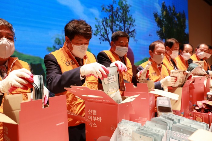 | ▲ 신협사회공헌재단 김윤식 이사장이 재단 임원들과 에너지 취약계층에 전달할 식품 및 위생용품을 어부바박스에 담고 있다.(사진제공=신협) |