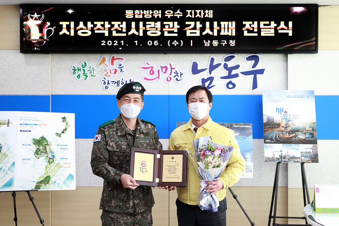 6일 예비군 육성 지원 사업을 체계적으로 지원해 온 인천 남동구가 통합방위태세 확립 및 예비군 육성지원 우수 지자체로 선정돼 ‘지상작전사령관 감사패’를 받았다. 사진은 지상작전사령관을 대신해 육군 17보병사단 507여단장으로부터 감사패를 전달받고 기념촬영을 하고 있는 이강호 구청장(오른쪽)의 모습. (사진제공=인천 남동구청)