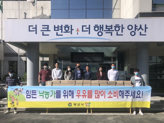 양산시는 코로나19로 인해 경영상 어려움을 겪고 있는 낙농가를 돕기 위해 실시한 우유 자율구매행사를 무사히 마쳤다. 직원들은 자발적으로 우유자율구매행사에 참여해 400만원 상당의 우유 및 유제품을 구매하였다.