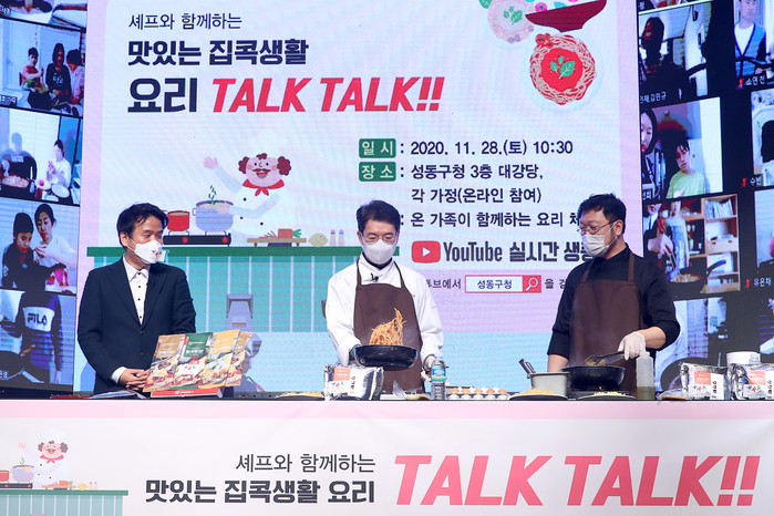 성동구는 최근 줌·유튜브 생중계로 코로나19로 힘든 주민들을 위로하는 온라인 요리체험 행사 ‘맛있는 집콕생활, 요리톡톡’를 개최했다. 사진은 정원오 구청장(가운데)과 이진형 셰프가 200여 가족과 비대면으로 로제파스타를 만들고 있는 모습. (사진제공=성동구청)