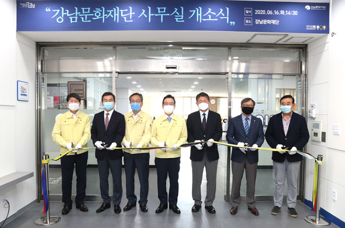 정순균 서울 강남구청장은 16일 '강남문화재단 본부 사무실 개소식'에 참석했다. 사진은 개소식에 참석한 정 구청장(가운데)이 관계자들과 테이프 커팅식을 진행하는 모습. (사진제공=강남구청)