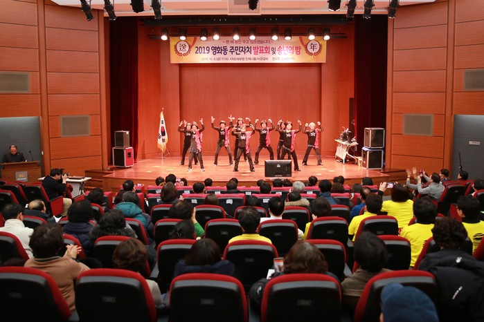 경기 수원시 장안구 영화동 주민자치위원회는 최근 KB인재니움 대강당에서 이병규 구청장을 비롯한 도·시의원 각계 인사와 단체원, 수강생, 주민 등 200여명이 참여한 가운데 ‘주민자치 작품발표회 및 송년의 밤’ 행사를 성황리에 개최했다. 사진은 참여자들이 공연을 선보이는 모습. (사진제공=장안구청)
