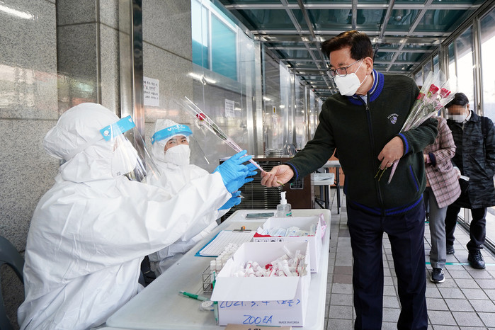 동대문구는 세계 여성의 날을 기념해 여성 직원에게 존중과 감사의 마음을 전하고, 지역 화훼농가를 돕기 위해 여성 직원에게 빵과 장미를 건네는 행사를 개최했다. 사진은 동대문구보건소 선별진료소에서 근무 중인 여성 의료진에게 장미를 전달하고 있는 유덕열 구청장의 모습. (사진제공=동대문구청)