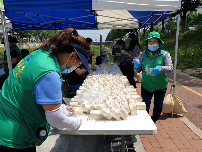 경기 안산시새마을회는 최근 안산천과 화정천 일대에서 새마을지도자 100여명이 참여한 가운데 ‘생태하천복원운동’을 전개했다. 사진은 'EM 세안비누 만들기 체험 행사'를 진행하고 있는 모습. (사진제공=안산시청)