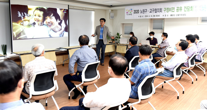 서울 노원구가 16일 불암산 산림치유센터에서 교구협의회와 구정현황 공유, 교류 활성화 방안 논의 등 상호 우호증진을 위한 구정비전 간담회를 개최했다. 사진은 오승록 구청장이 협의회 임원들에게 구정비전을 설명하는 모습. (사진제공=노원구청)