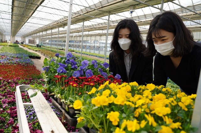 | ▲ 해남군 농업기술센터 꽃 육묘장. 농업기술센터 직원들이 개화 현황을 살펴보고 있다. / 해남군 제공 |