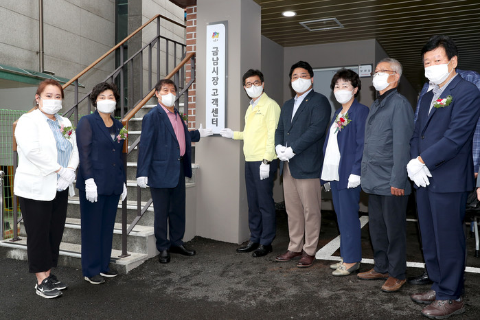 성동구는 최근 금남시장 고객센터(성동구 금호산2길 32)를 열었다. 센터는 지상 2층·연면적 104.72㎡ 규모로 건물 2층에 고객지원센터, 상인회사무실 등 주요 편의시설을 설치했다. 사진은 개소식에서 정원오 구청장(가운데 오른쪽)이 관계자들과 기념촬영을 하고 있는 모습. (사진제공=성동구청)