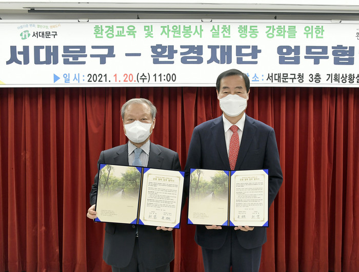서울 서대문구가 환경문제에 대한 시민공감대 확산을 위해 20일 환경재단과 업무협약을 맺었다. 협약을 통해 두 기관은 환경교육과 자원봉사 실천행동을 강화하기 위해 함께 협력한다. 사진은 협약식에서 문석진 구청장(오른쪽)과 최열 이사장이 기념촬영을 하는 모습. (사진제공=서대문구청)