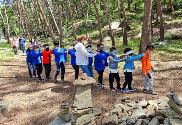 또한 친구들과 협동하여 ‘애벌레 걷기’라는 주제로 시각장애인 체험을 해보고, 숲 주변의 돌을 이용하여 돌탑 쌓기, 통나무위에서 가위바위보 게임, 나무에 매달리기 등 숲속놀이를 통하여 평소 접하기 쉽지 않은 숲 체험으로 어린이들이 자연과 호흡하며 숲의 소중함을 배우는 시간이 되었다.
