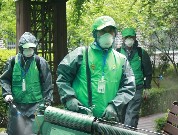 코로나19 확산으로 연기했던 전국 학교 개학이 지난 20일부터 순차적으로 재개됨에 따라 서울 마포구가 감염병 예방을 위한 지역내 학교 방역활동에 돌입했다. 사진은 최근 구 새마을자율방역대 대원들이 개학을 앞둔 신수중학교에서 방역작업을 하는 모습. (사진제공=마포구청)