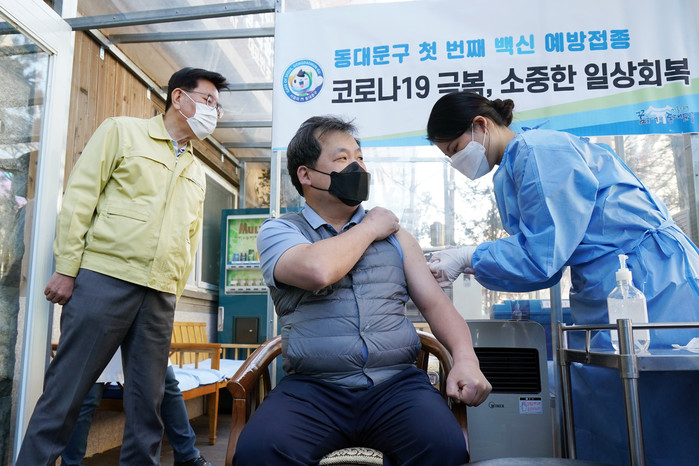 동대문구는 지난 2월26일부터 요양병원 8곳에서 1197명을 대상으로 순차적으로 코로나19 백신을 접종하고, 오는 8일부터는 요양시설 6곳의 138명을 대상으로 동대문구 보건소에서 접종을 실시한다. 사진은 유덕열 구청장(왼쪽)이 지켜보는 가운데 구에서 최초로 최창락 왕십리휴요양병원장이 백신을 접종하고 있는 모습. (사진제공=동대문구청)