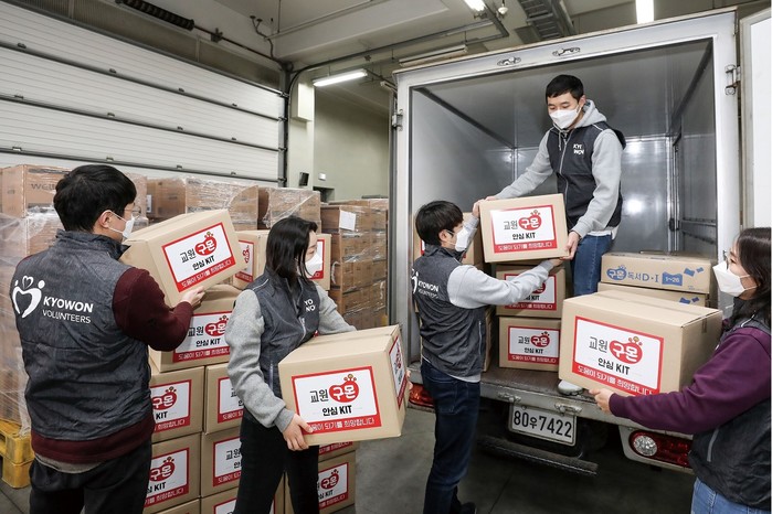 | ▲ 교원그룹 임직원들이 코로나19 예방을 위해 대구경북지역 저소득층 아동들에게 보낼 안심키트를 차에 싣고 있다.(사진제공=교원그룹) |