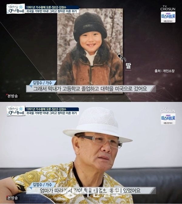 이날 방송에서 김정수는 아내와 이혼 위기를 겪었다고 털어놨다. 그는 "처갓집이 뉴욕이다. 막내가 고등학교를 졸업하고 대학을 미국으로 하며 애 엄마가 따라갔다. 그렇게 기러기 아빠가 됐다"고 말문을 열었다.