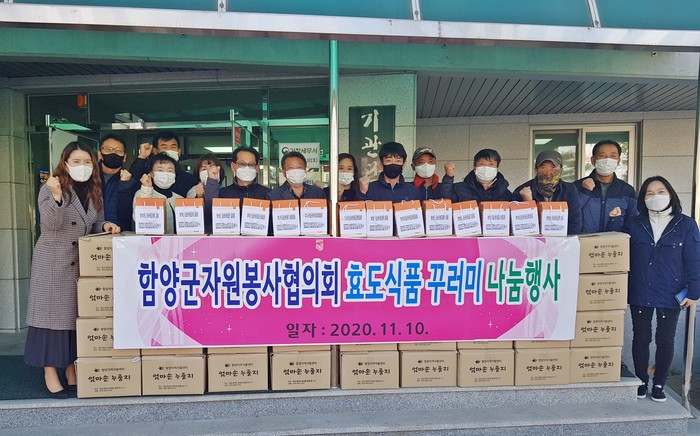 경남 함양군 자원봉사협의회(회장 이상수)는 10일 오전 기관단체청사 앞에서 효도꾸러니 나눔행사를 개최하여 관내 취약계층 어르신 250세대에 효도꾸러미를 제작하여 전달하였다.