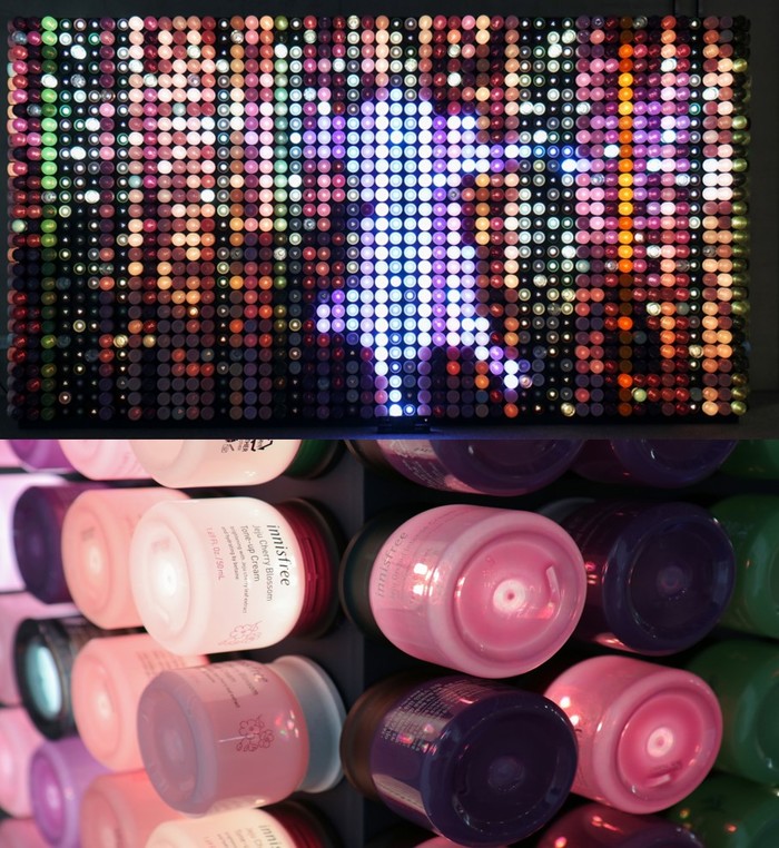 고객들이 아모레퍼시픽그룹 매장에 반납한 공병 중 1652개를 활용해 제작한 업사이클링 예술작품 '1652人의 여름들'은 관객참여형 인터랙티브 미디어아트다.