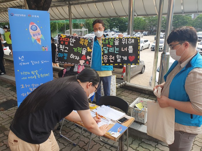 경기 구리시는 지난 22일 2차 검정고시 시험에 응시하는 구리시청소년지원센터 꿈드림 학교밖 청소년 35명에게 응원물품(마스크·손소독제 등 위생용품과 간식) 등을 지원했다. 사진은 고사장에서 응시생에게 응원물품을 제공하는 모습. (사진제공=구리시청)