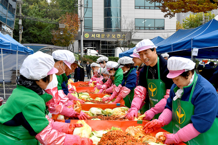 서울 서대문구 새마을부녀회가 지난 12~13일 구청 광장에서 취약계층을 위한 '2019 사랑의 김장나누기' 행사를 개최했다. 이날 담근 김치는 지역내 저소득 가정과 복지시설에 전달될 예정이다. 사진은 문석진 구청장과 회원들이 김치를 만드는 모습. (사진제공=서대문구청)