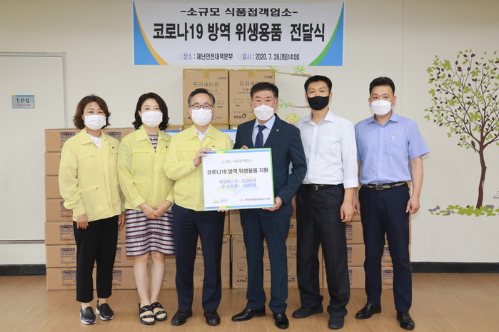 서울 금천구는 소규모 식품접객업소 지원을 위한 방역 위생용품을 (사)한국외식업중앙회금천구지회에 전달했다. 구는 50㎡ 미만 소규모 식품접객업소 약 1500곳에 위생마스크 7만5000개와 손소독제 3000개를 지원한다. 전달식에서 유성훈 구청장(왼쪽에서 세 번째)과 관계자들이 기념촬영을 하는 모습. (사진제공=금천구청)