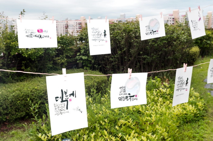 서울 양천구는 코로나19로 심적 피로를 느낄 구민들을 응원하기 위해 캘리그라피를 이용한 힐링 엽서 7종을 제작했다. 구는 이번 엽서를 통해 구청 방문객 및 구민들에게 따뜻한 위로와 응원의 메시지를 전달할 예정이다. 사진은 구청사에 전시된 응원의 메시지를 담은 엽서들. (사진제공=양천구청)