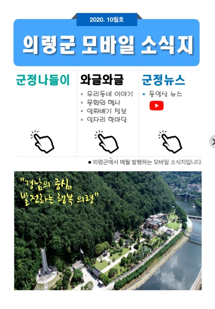 의령군은 시대의 변화에 부응하고 군민이 보다 편리하게 군정소식을 접할 수 있도록 모바일 소식지 「의령군 모바일 소식지」 10월호를 창간한다고 밝혔다.
