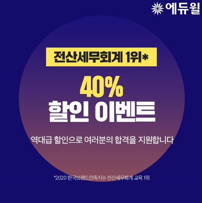 전산세무회계 40% 할인 이벤트에 대한 자세한 내용은 에듀윌 홈페이지에서 확인 가능하다.