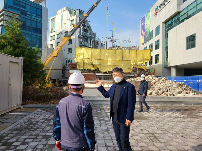 | ▲ 현장을 방문한 전영준 의원이 관계자와 현장에 대해 이야기를 나누고 있다. (사진제공=종로구의회) |