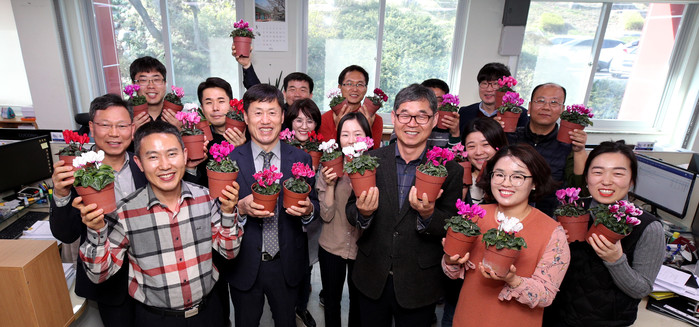 지난 20일 오후 팽현일 산청군 부군수와 도시교통과 직원들이 코로나19로 어려움을 겪는 지역 화훼농가를 돕기 위해 구매한 시클라멘 화분을 들고 사진촬영을 하고 있다.